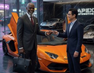 La escena era digna de una película de Hollywood. En el exclusivo concesionario Apex Automotive, las luces de neón se reflejaban sobre la carrocería impecable de un deportivo de lujo color naranja brillante. Un hombre afroamericano de avanzada edad, con un traje gris perfectamente entallado y un maletín de cuero que destilaba elegancia, acababa de cerrar el trato de su vida.