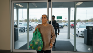 En la puerta automática, una mujer de avanzada edad, con el cabello canoso recogido en un moño impecable y una sencilla sudadera café, caminaba lentamente cargando una bolsa de plástico llena de frutas. Sus pasos eran pausados, producto de los años y de una rodilla que ya no respondía como antes.