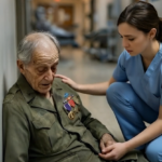 Manuel, con la dignidad que solo un soldado conoce, no gritó. Simplemente se dejó caer en el pasillo, con el corazón más roto que sus pulmones. Fue entonces cuando apareció Elena, una joven enfermera cuyo uniforme azul contrastaba con la palidez de su rostro al ver aquella escena.