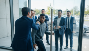 Mateo, visiblemente impactado y humillado, fue empujado hacia la salida ante las carcajadas de todo el equipo de ventas. La puerta de cristal se cerró con un estruendo, dejando al joven solo en la acera, bajo la mirada burlona de quienes se creían superiores.