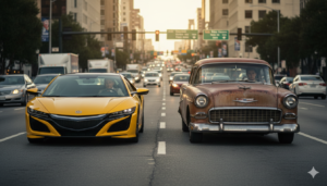 A escasos centímetros, un sedán oxidado de los años 50 intentaba avanzar con dificultad. Su conductor, Mateo, un joven trabajador que apenas llegaba a fin de mes, mantenía las manos firmes en el volante, ignorando el lujo que tenía al lado. Pero Julián no podía ignorar la «mancha» que el viejo auto representaba para su impecable vista.