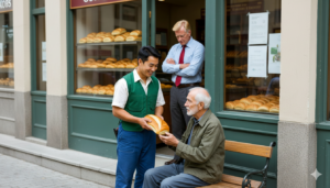 Mateo no lo pensó dos veces. Tomó una de las barras más grandes y crujientes, salió al frío de la calle y se arrodilló frente al anciano.