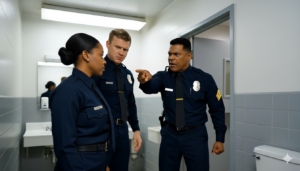 Rosario, manteniendo una calma que solo la verdadera disciplina otorga, intentó ignorarlo, pero Ryan la sujetó violentamente del cuello. La escena era degradante: un oficial de policía utilizando su fuerza para intentar humillar a una compañera sobre un inodoro, buscando arrebatarle no solo el aliento, sino su dignidad humana.