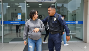 Era una mañana calurosa, de esas donde el asfalto parece derretirse bajo los pies. Sofía, una joven de aspecto sencillo, vestida con una sudadera gris holgada y unos jeans rotos, caminaba con dificultad hacia la entrada del Banco Nacional. Su respiración era agitada; el avanzado estado de su embarazo la hacía sentirse fatigada, y solo buscaba un poco de refugio y hablar con la administración.