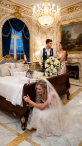 El aire en la mansión era denso, cargado con el aroma de miles de flores blancas y el costo de una boda que superaba los siete dígitos. Elena, vestida con un diseño exclusivo que la hacía parecer una aparición divina, buscaba un momento de paz antes de caminar hacia el altar. Fue entonces cuando, por puro azar del destino, se encontró escondida tras la imponente cama de caoba tallada.