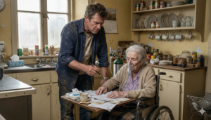 Mark, vestido con una camisa de mezclilla sucia y jeans gastados, veía en su madre no a una mujer que le había dado la vida, sino una carga insoportable. El dinero escaseaba, las facturas se acumulaban sobre la mesa y la tensión en el hogar era palpable. Aquella mañana, la atmósfera era particularmente densa. Mark, con el ceño fruncido y la mandíbula apretada, revisaba unos documentos legales sobre la mesa llena de papeles y tazas de café vacías. Elara, con la máscara de oxígeno cubriendo su rostro, observaba con temor, presentía que algo terrible estaba por suceder.