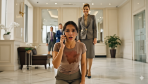 Elena retrocedió, llevándose las manos al pecho, con los ojos llenos de lágrimas que se negaba a dejar caer. El teléfono de Elena resbaló de sus manos y cayó al suelo con un golpe seco. Mientras ella se arrodillaba para recogerlo, Victoria continuó con su ataque verbal, sintiéndose más poderosa que nunca al ver a la joven en el suelo.