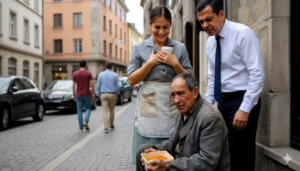 ¿Alguna vez te has preguntado si el destino te está observando a través de los ojos de un desconocido? A veces, una simple acción de caridad puede ser la llave que abra las puertas de un futuro brillante o, por el contrario, el mazo que destruya lo que tanto te costó construir. En el corazón de la ciudad, frente a uno de los restaurantes más exclusivos de la zona, se gestó una historia que nos recuerda que la bondad nunca pasa de moda y que la soberbia tiene un precio muy alto.