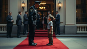 El niño retrocedió, las lágrimas finalmente escapando de sus ojos y rodando por sus mejillas. El miedo y la vergüenza se mezclaron en su pecho. Se sentía pequeño, no solo por su edad, sino por el peso del juicio social que ese hombre acababa de arrojar sobre él. El guardia, satisfecho con su «victoria», volvió a su postura rígida, sin saber que el suelo bajo sus pies estaba a punto de desaparecer.