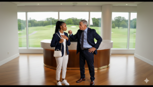 La mañana era radiante sobre el campo de golf. El rocío aún brillaba en el césped perfectamente podado cuando una joven mujer, vestida con un elegante pero sencillo conjunto blanco y azul, cruzó el umbral de la recepción. No llevaba joyas ostentosas, solo una pequeña cartera blanca y una determinación inquebrantable en su mirada.