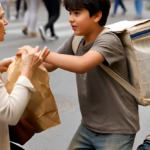 Un pequeño niño de ropa desgastada, que observaba desde una esquina, corrió de inmediato para auxiliarla. «¿Se encuentra bien, señora?», preguntó Samuel con genuina preocupación mientras intentaba levantar una de las pesadas bolsas.