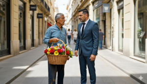 Un hombre mayor, de cabellos canosos y ropa desgastada, tropezó accidentalmente con él. El anciano sostenía una canasta repleta de flores frescas, cuyos pétalos, tras el impacto, rozaron la impecable tela del traje de Julián.