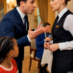 La pequeña Maya, con los ojos llenos de lágrimas, intentó balbucear una respuesta, pero el nudo en su garganta se lo impidió. Las manos de la niña temblaban sobre el mantel blanco. Algunos comensales bajaron la mirada, incómodos, pero nadie se atrevía a desafiar la autoridad de la implacable jefa de sala.